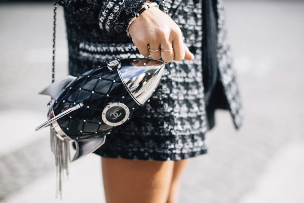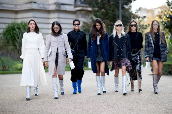 具有未来感的银色和金属元素广泛运用,比如Chanel的火箭包包和因素及膝靴,可是2018年春夏时装周街拍中最为抢眼的单品。