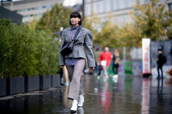 干练硬朗的西装或者大衣外套加上宽肩的设计,有一种“女扮男装”的感觉,上宽下窄的廓形还十分显瘦。